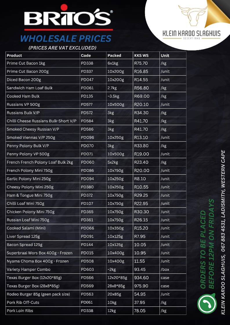 Collection of wholesale items available through Klein Karoo Slaghuis